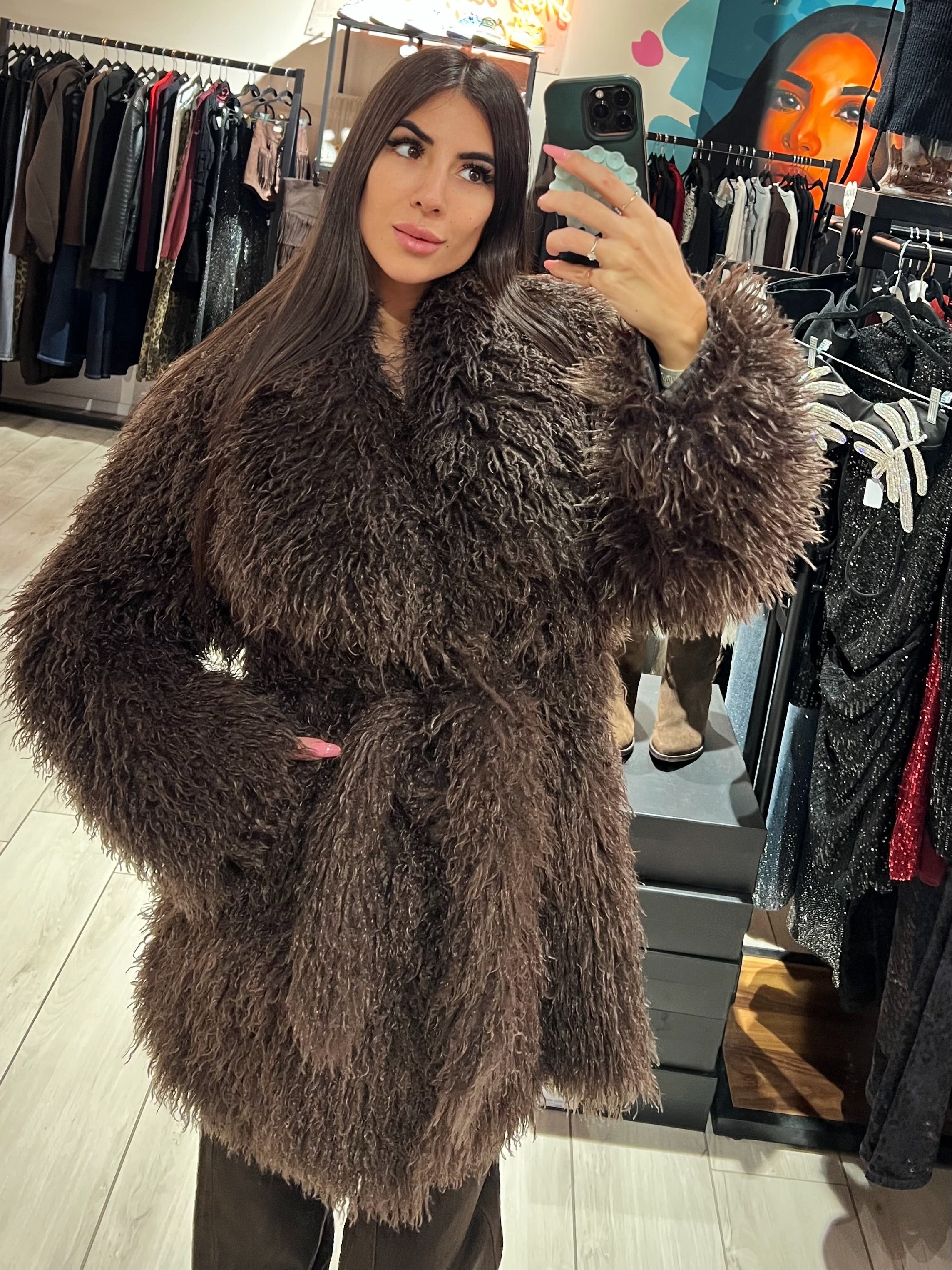 Pelliccia Mongolia ecologica morbida e voluminosa con tripla chiusura a clip frontale e cintura in vita rimovibile