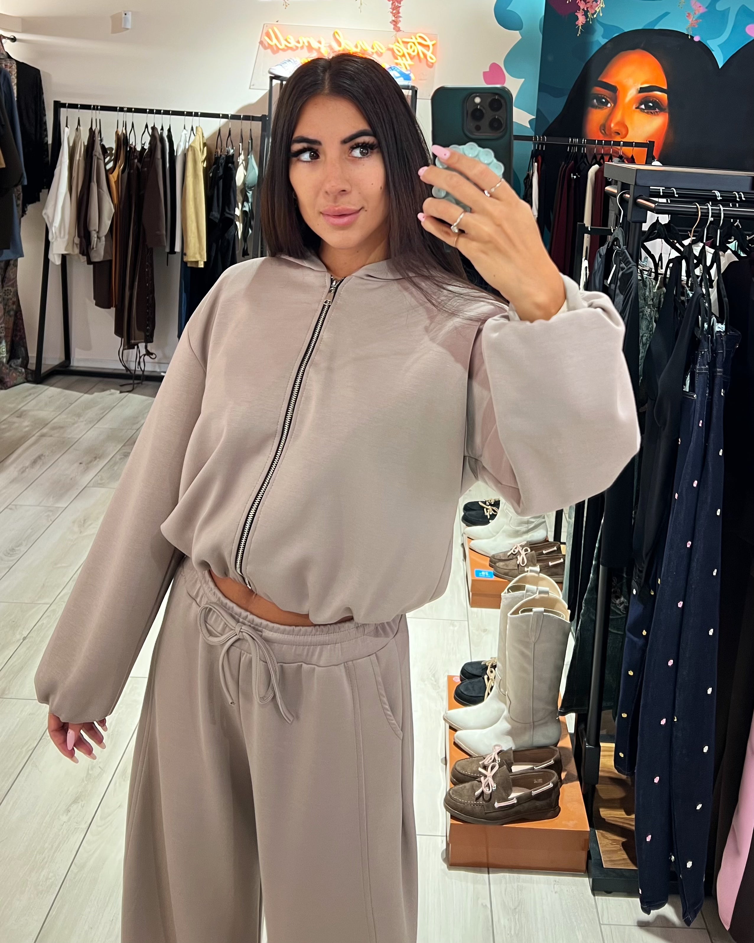 Set coordinato tuta con pantaloni elasticizzati balloon fit e felpa con zip e cappuccio