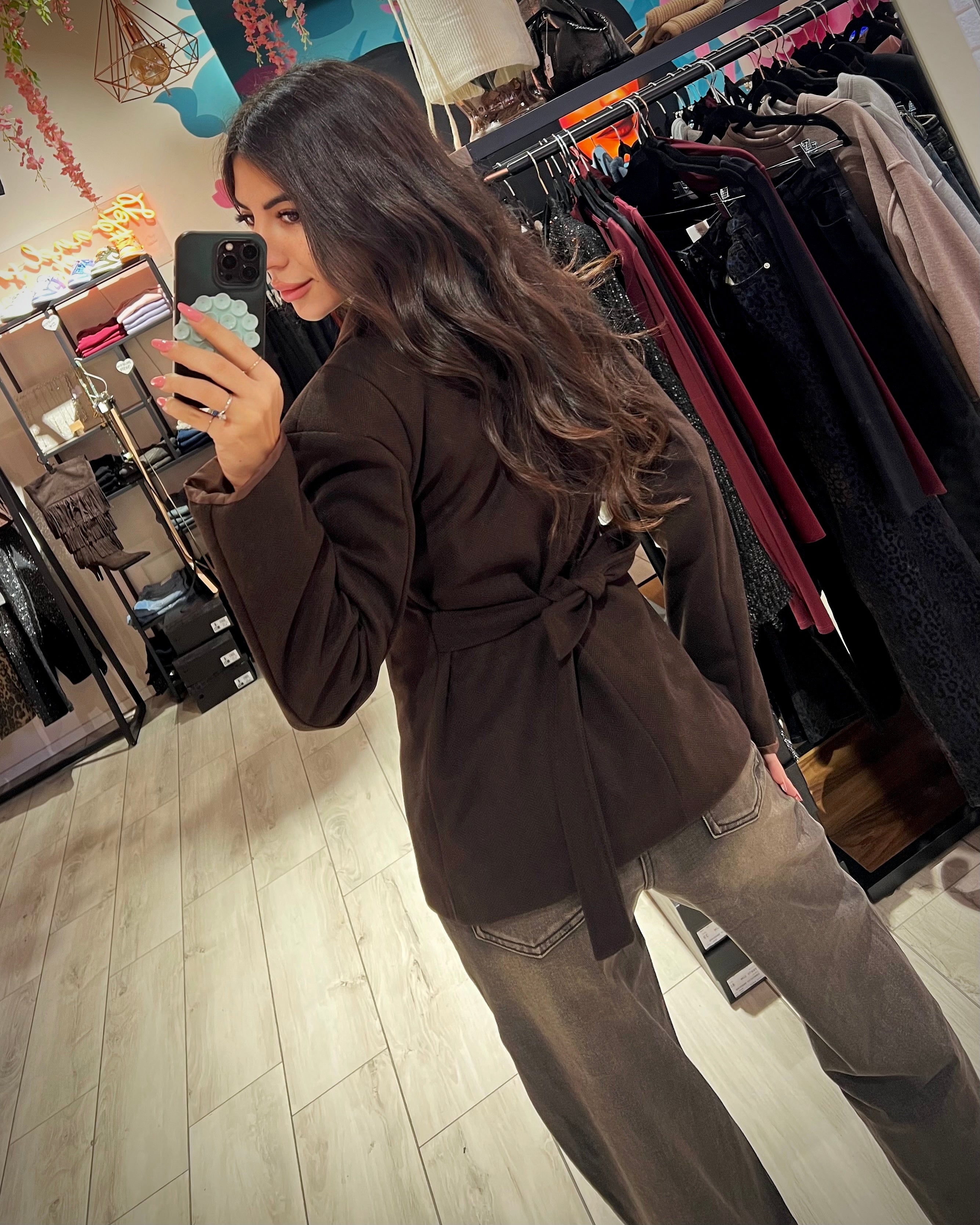 Blazer sfiancato e strutturato con maxi spalla rinforzata a trama spiga con chiusura frontale doppio petto e laccio regolabile posteriore