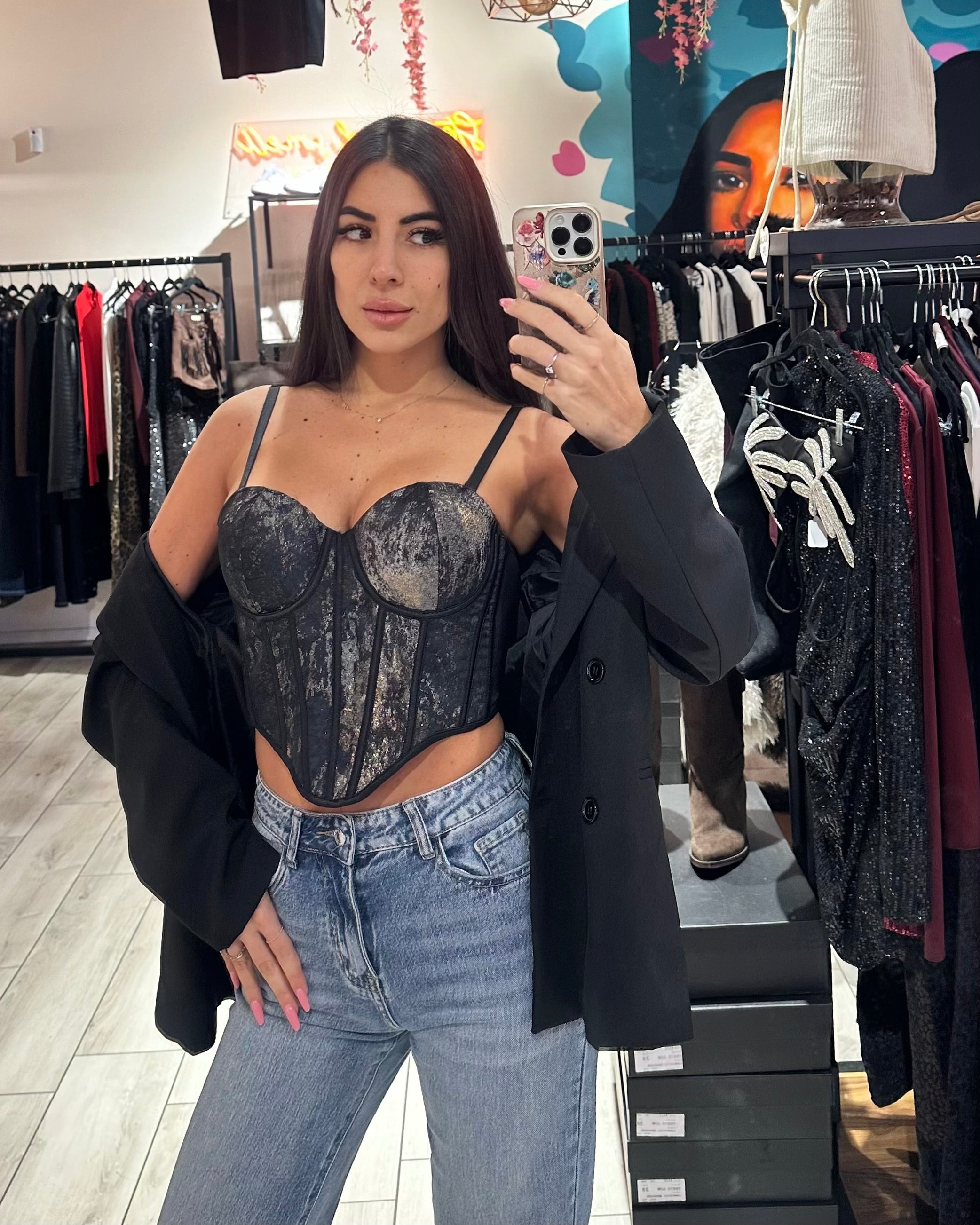 Corsetto con coppette preformate, spalline regolabili e spennellate laminate champagne e blu navy su base nero
