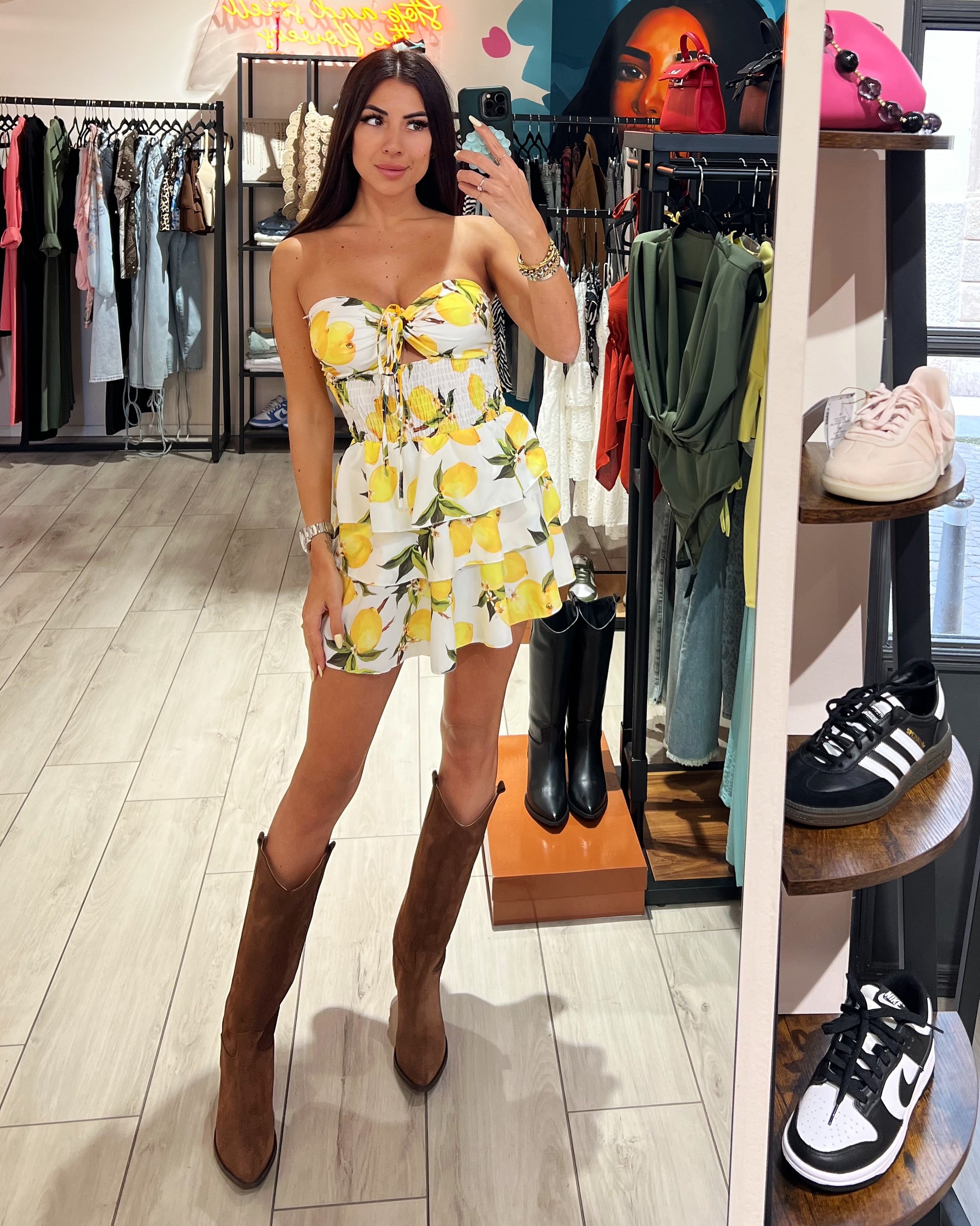 Vestito elasticizzato con coppette preformate, allacciatura al collo e gonna svasata con balze