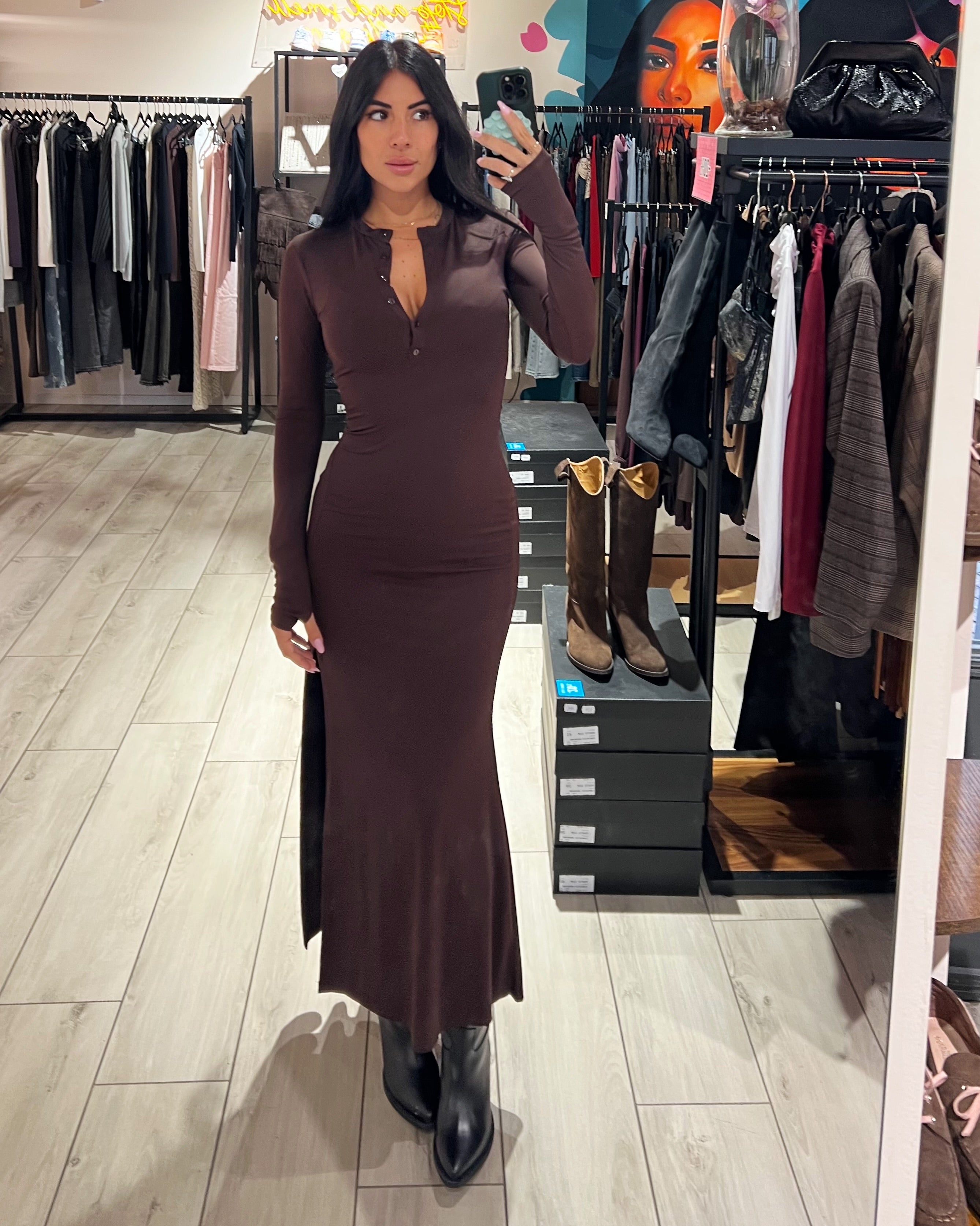 Abito lungo elasticizzato con scollo bottoncini, manica a guanto e gonna con spacco frontale e fondo a sirena