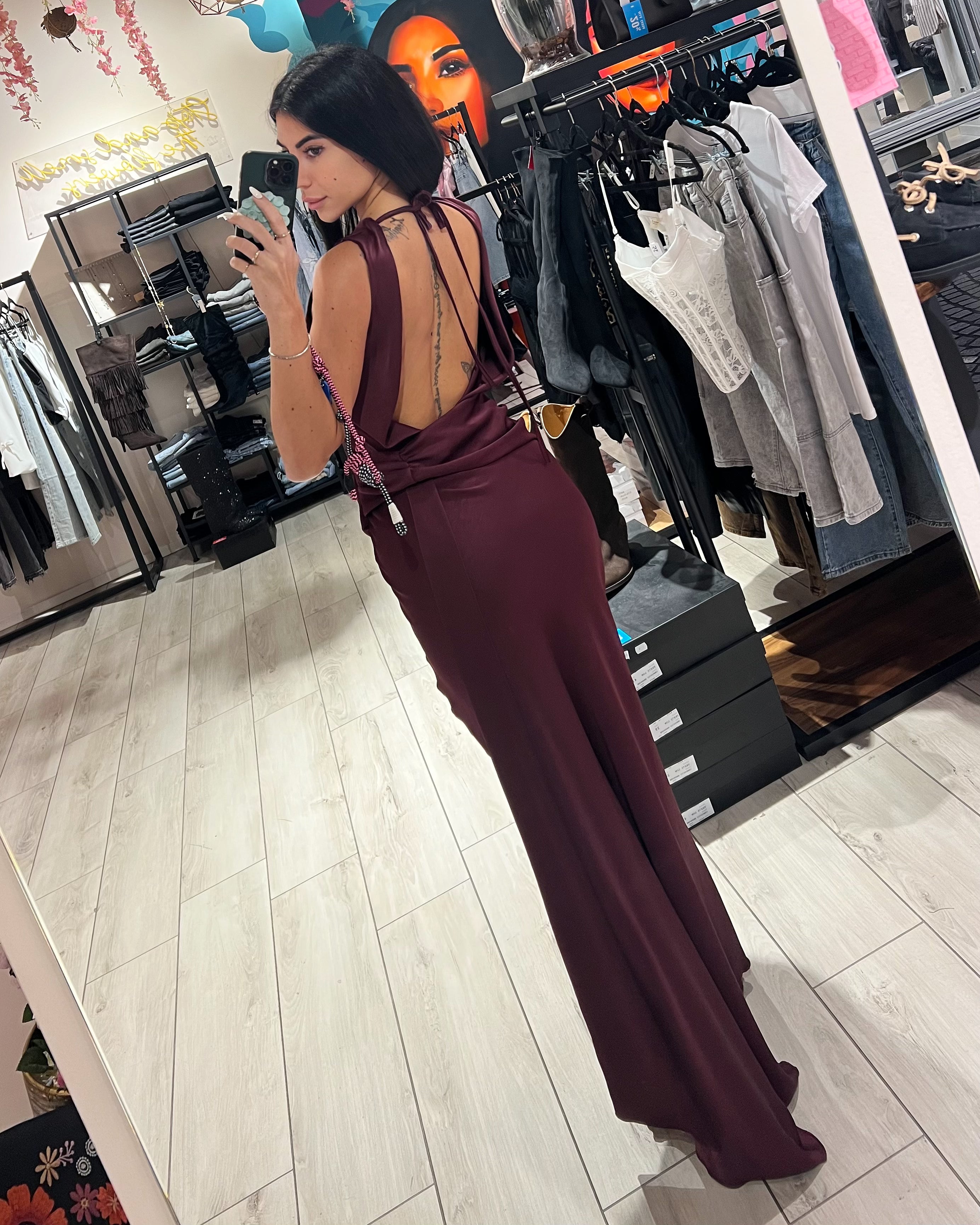Abito lungo in raso scivolato con schiena scoperta e drappeggio fronte e retro