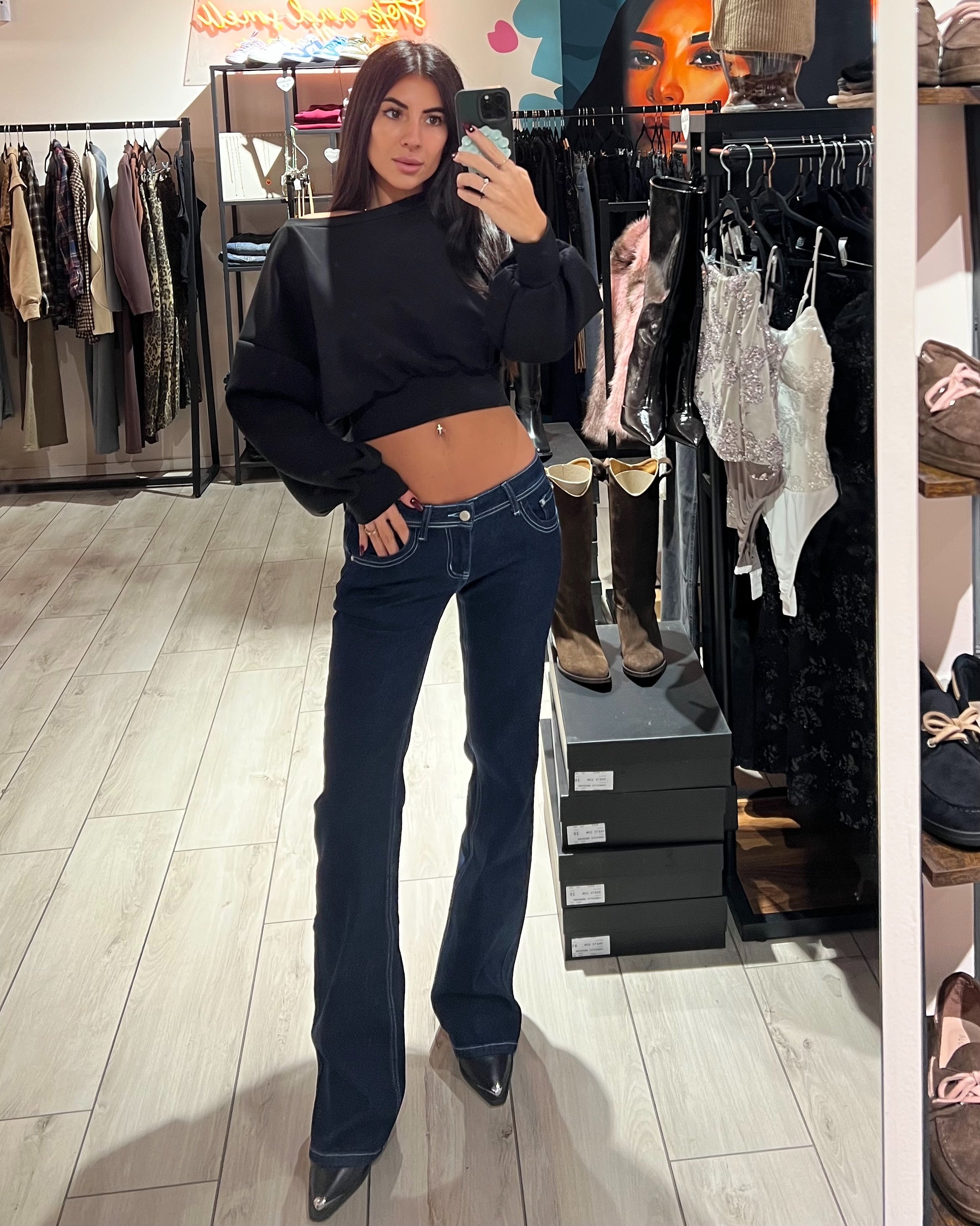 Jeans modello bootcut super vita bassa colore blu profondo con cuciture a contrasto bianche