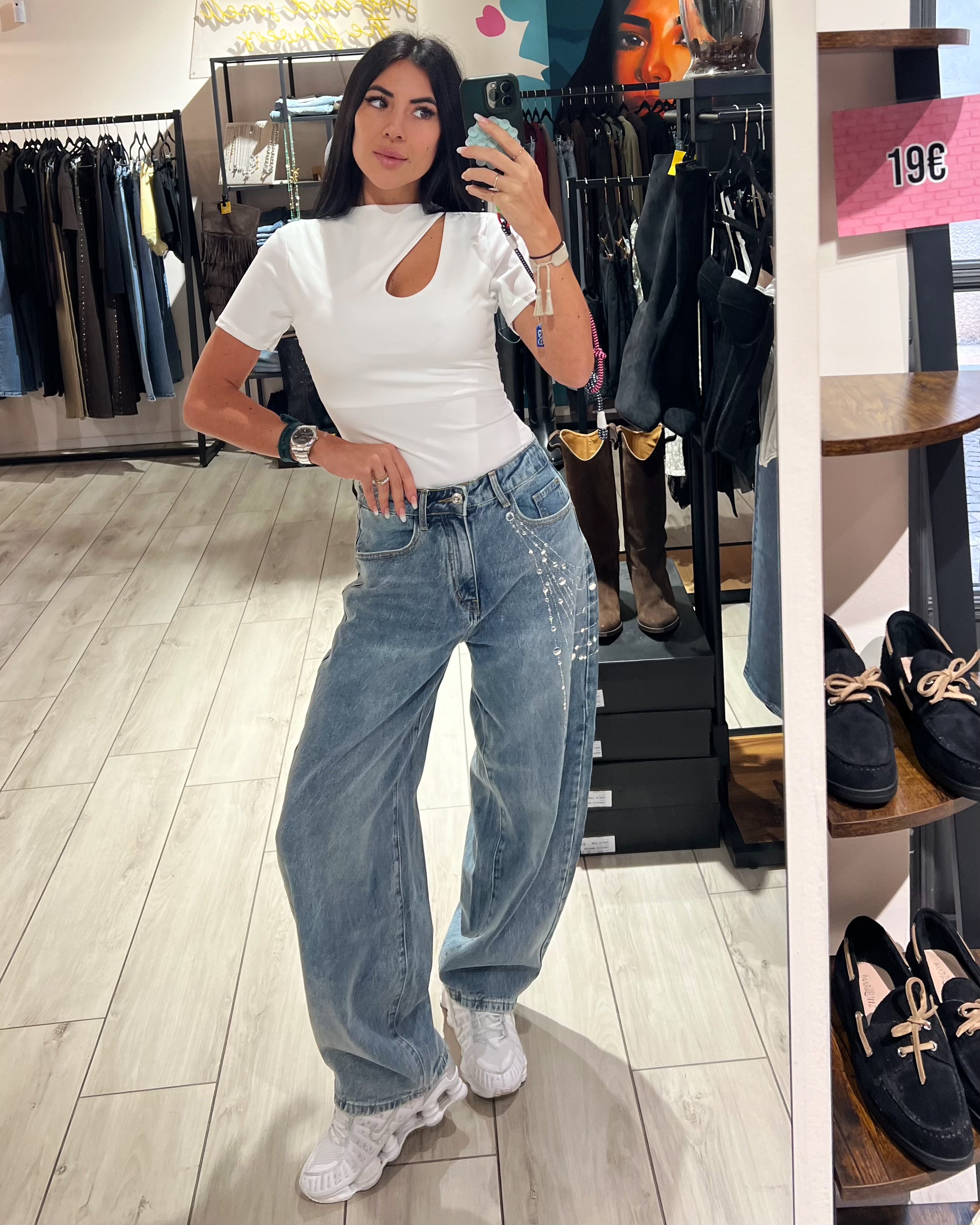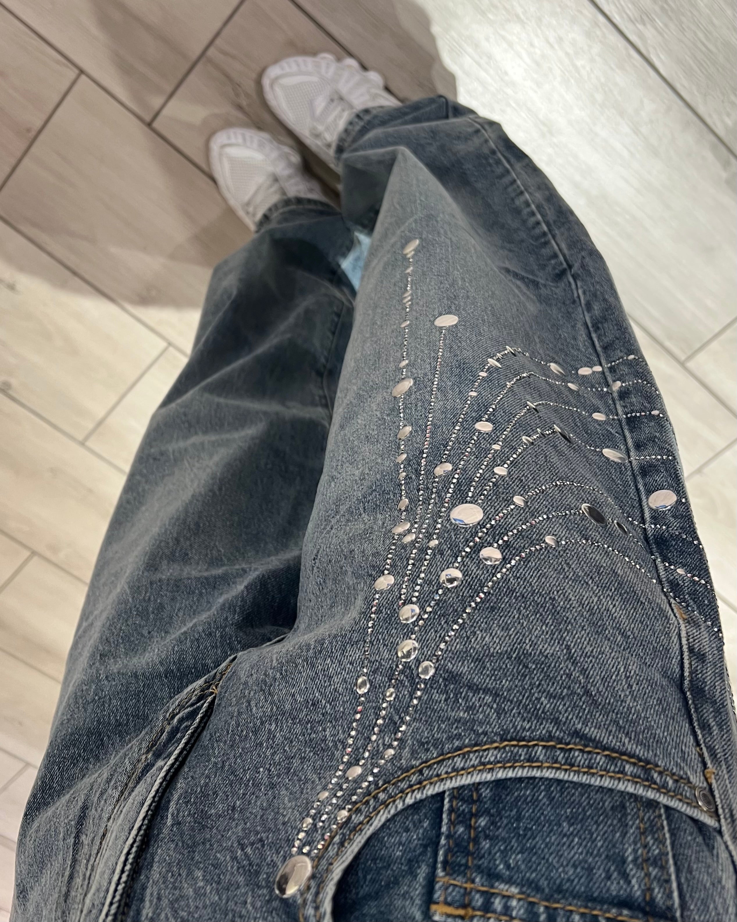 Jeans modello balloon con applicazione laterale di borchie luminose