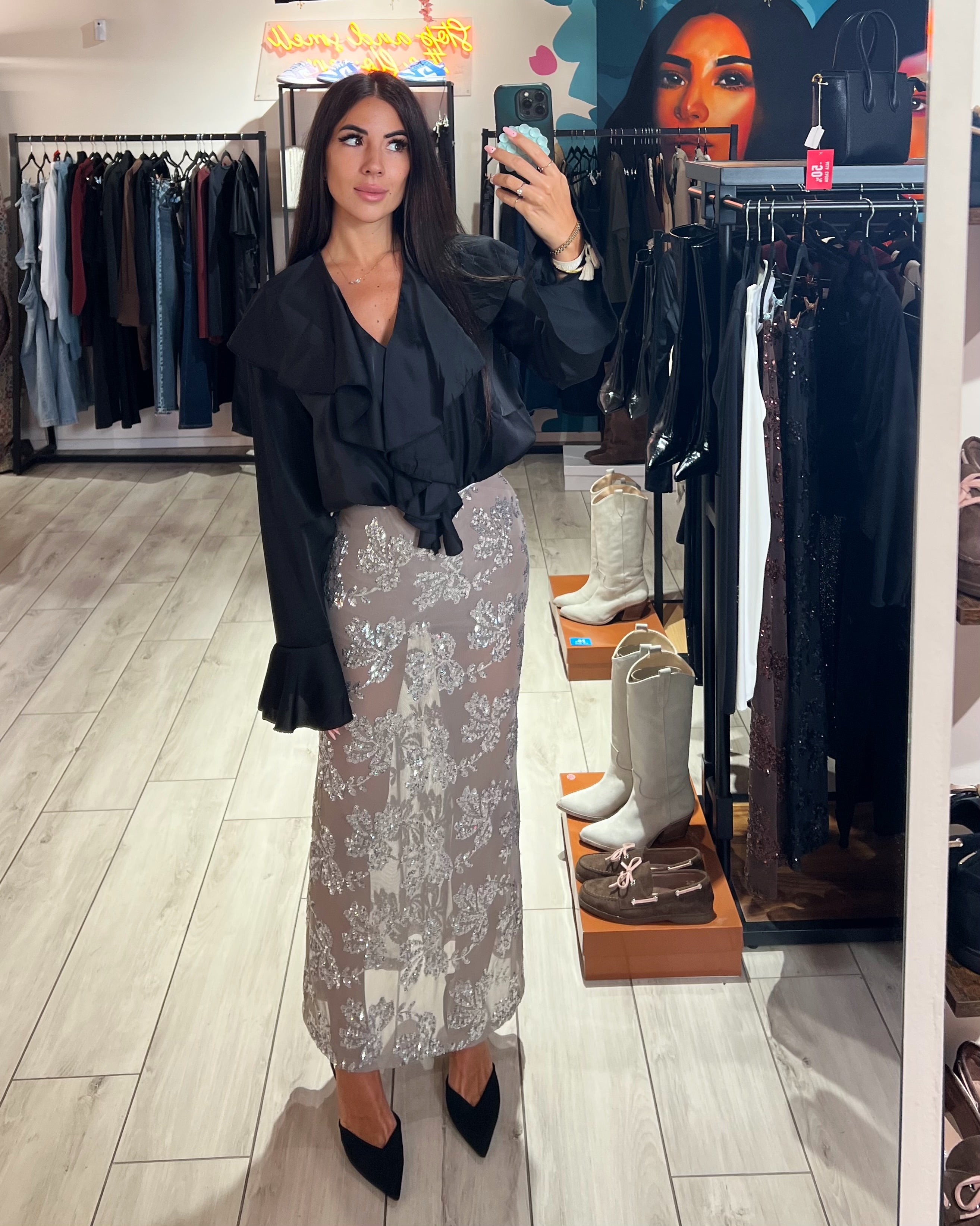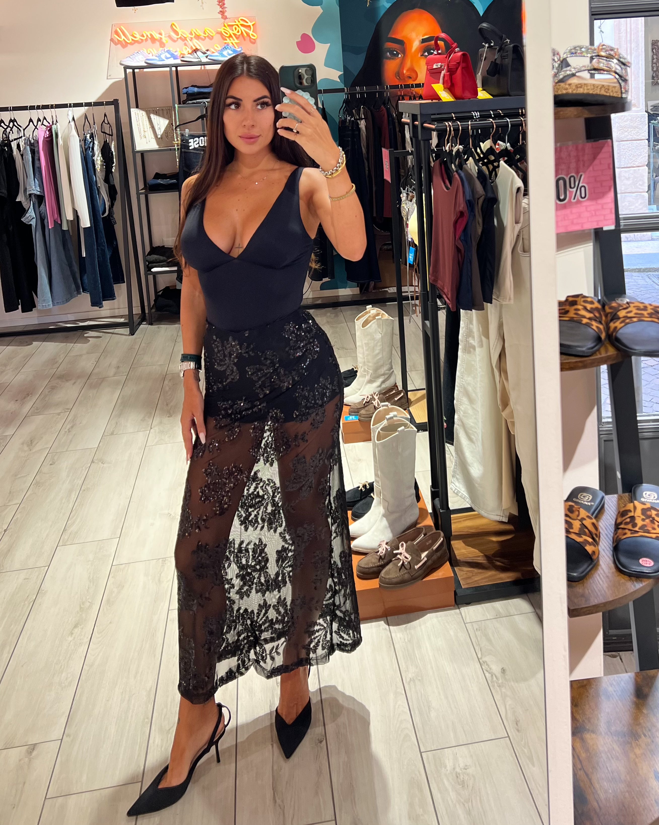 Gonna lunga in trasparenza con culotte incorporata e dettagli floreali di pailettes
