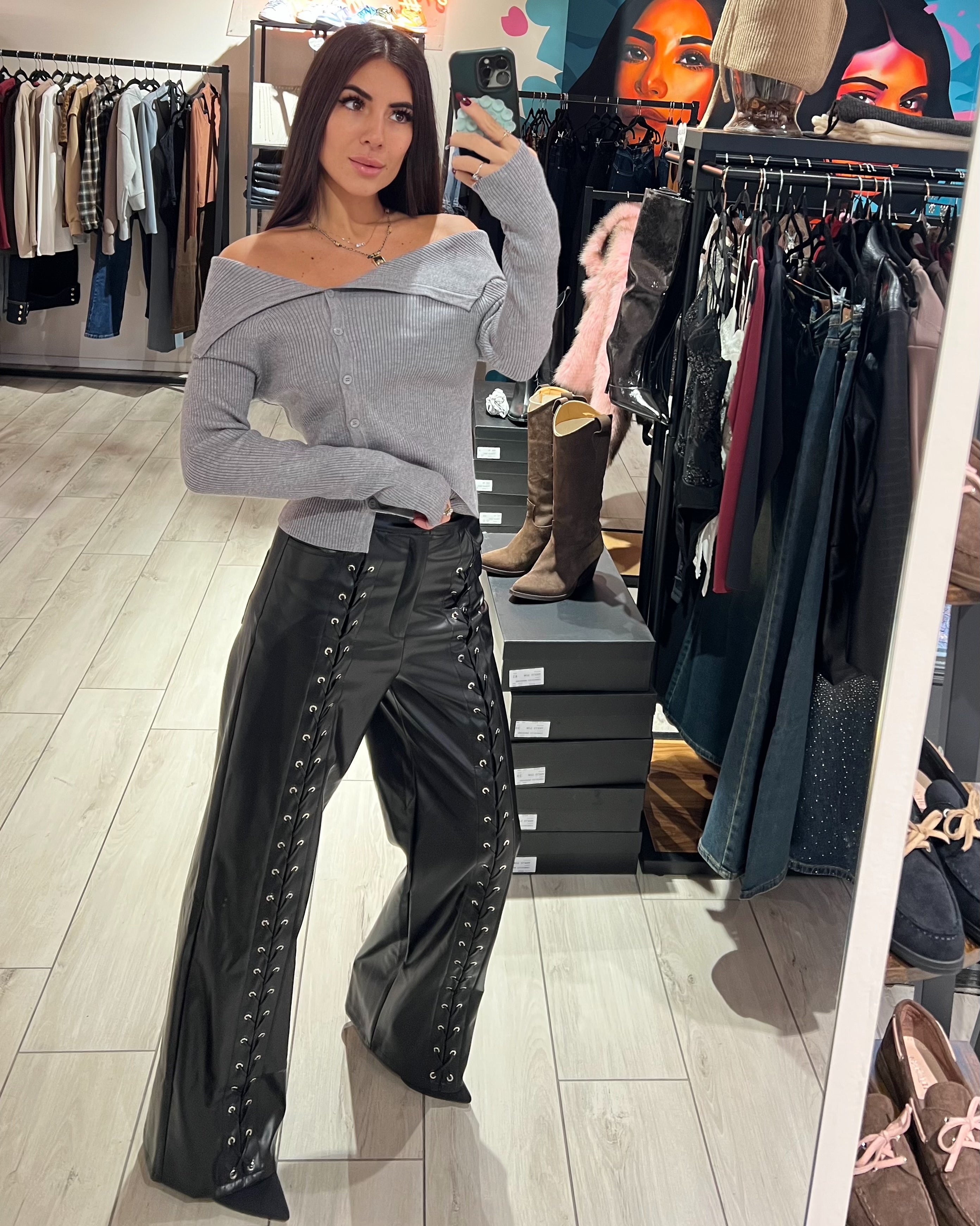 Pantalone wide leg in morbida ecopelle con lacci frontali effetti corsetto