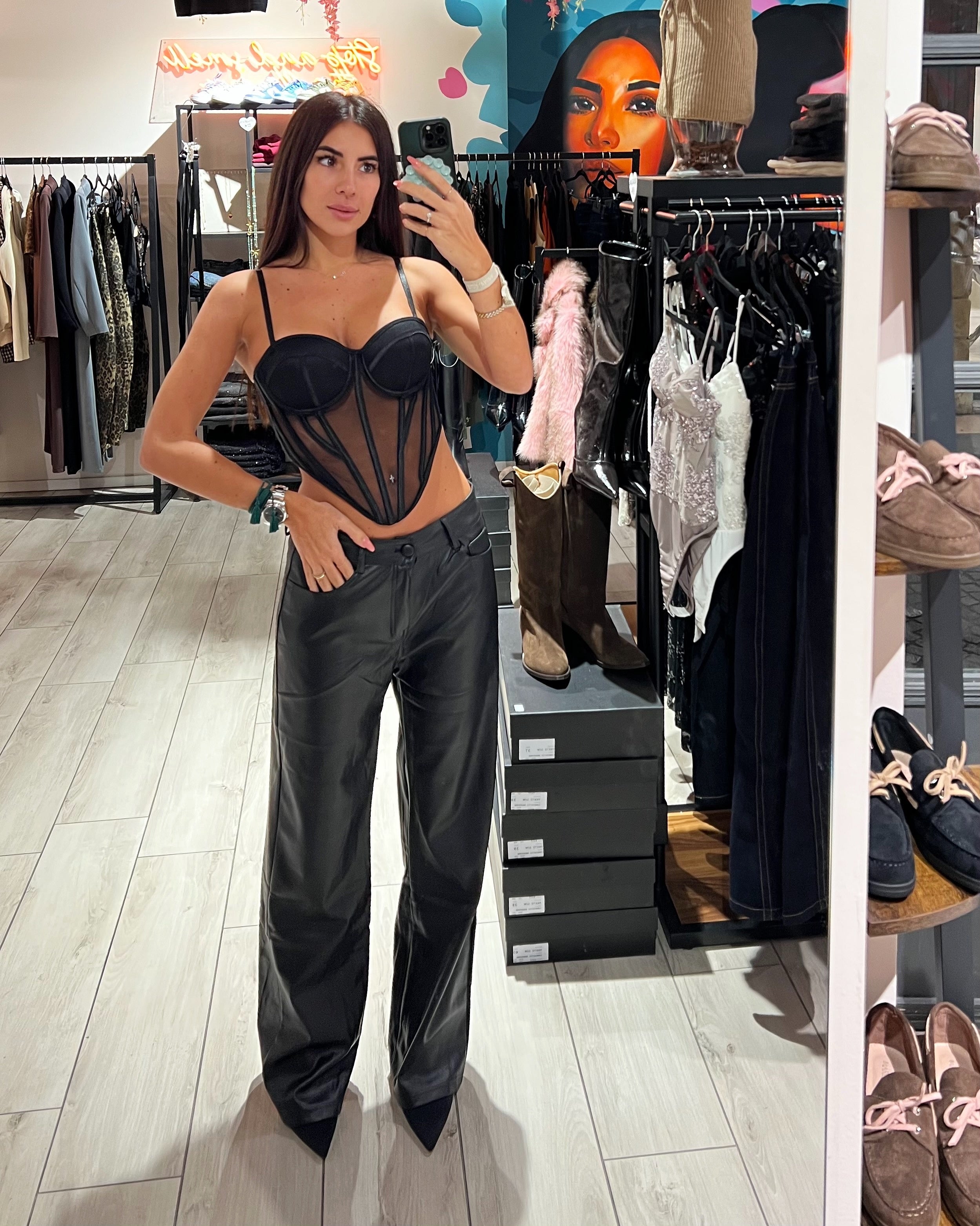 Pantalone in morbida ecopelle modello gamba dritta con bottone rivestito