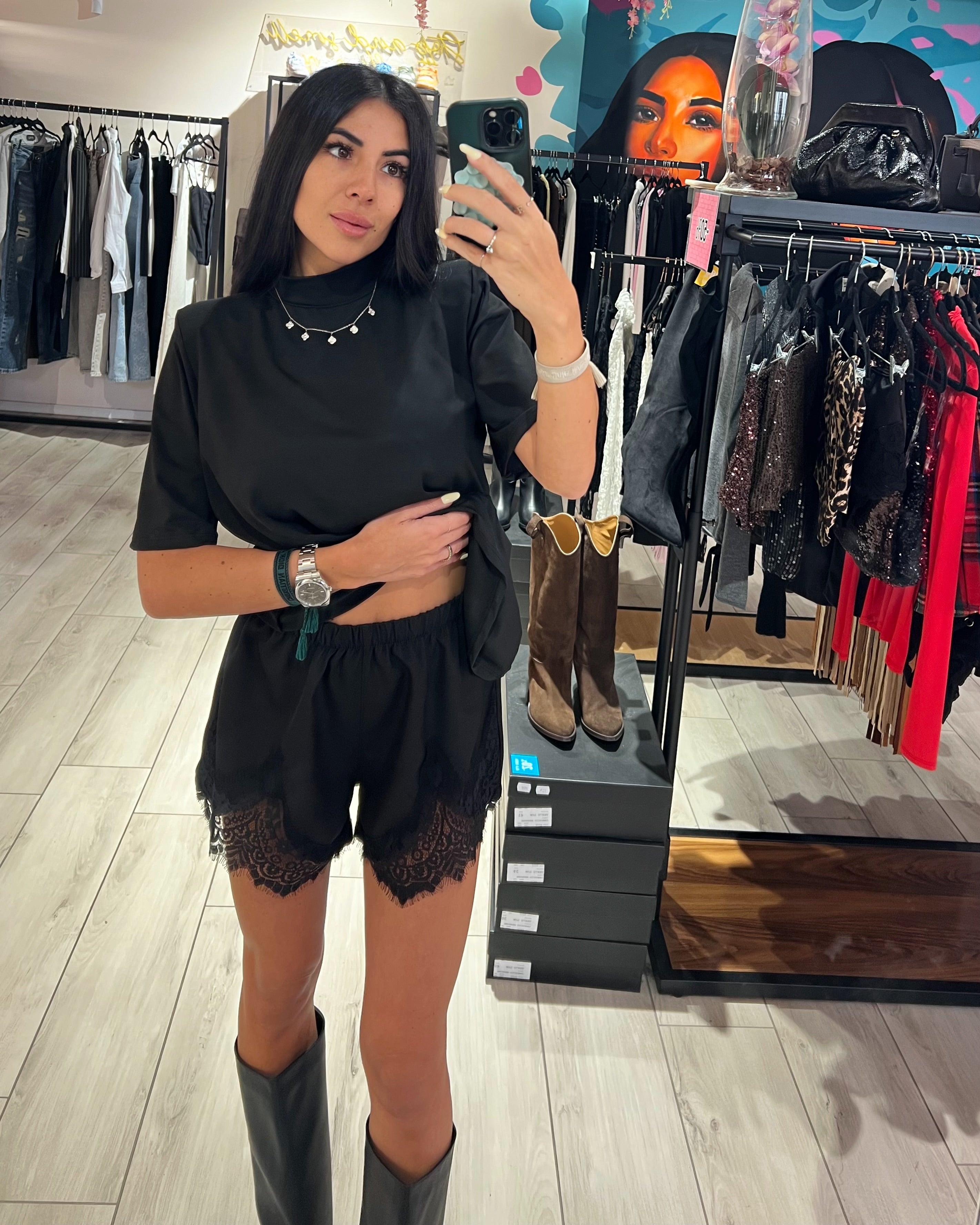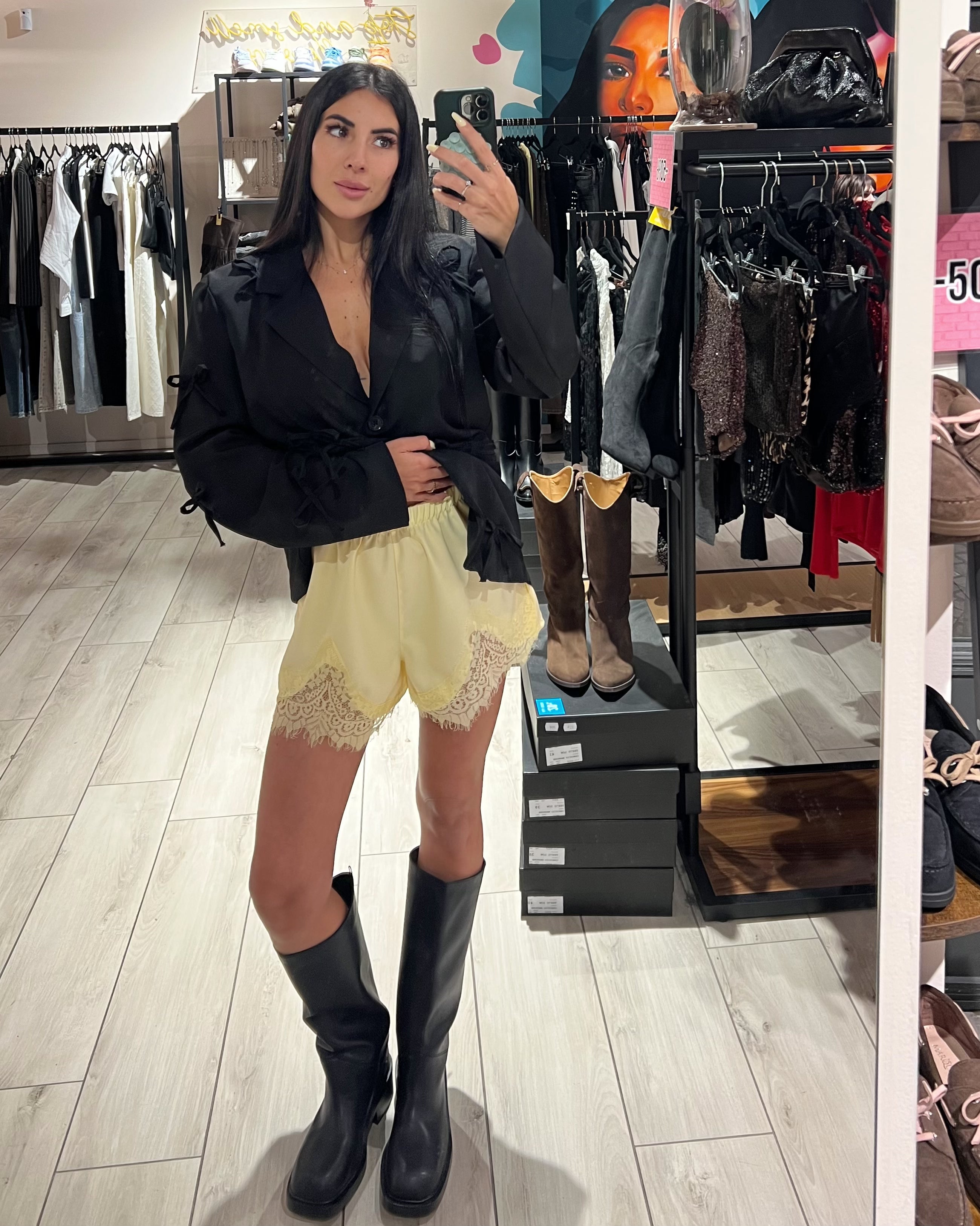 Shorts elasticizzati effetto raso con fondo in pizzo frontale